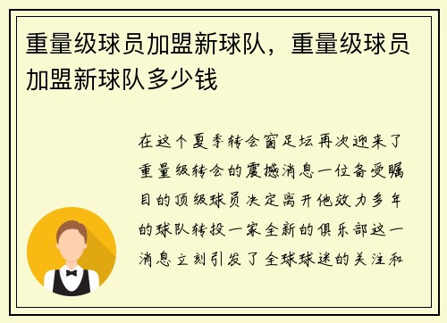 重量级球员加盟新球队,重量级球员加盟新球队多少钱
