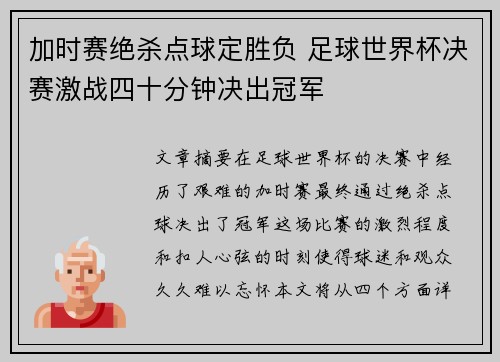 文章摘要:在足球世界杯的决赛中,经历了艰难的加时赛,最终通过绝杀点球决出了冠军。这场比赛的激烈程度和扣人心弦的时刻使得球迷和观众久久难以忘怀。本文将从四个方面详细阐述加时赛绝杀点球如何成为世界杯决赛的关键决定因素。首先,我们将回顾比赛的整体...
