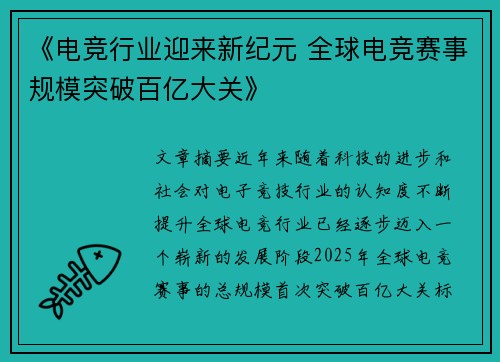 《电竞行业迎来新纪元 全球电竞赛事规模突破百亿大关》