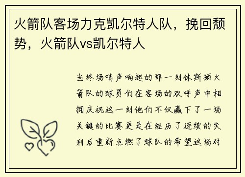 当终场哨声响起的那一刻,休斯顿火箭队的球员们在客场的欢呼声中相拥庆祝。这一刻,他们不仅赢下了一场关键的比赛,更是在经历了连续的失利后,重新点燃了球队的希望。这场对决的对手是波士顿凯尔特人队,一支以坚韧和团队精神著称的队伍。火箭队凭借关键时刻...