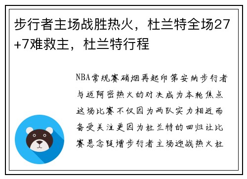 步行者主场战胜热火,杜兰特全场27+7难救主,杜兰特行程