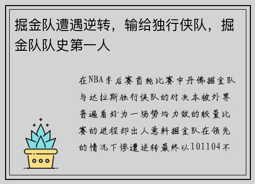 在NBA季后赛首轮比赛中,丹佛掘金队与达拉斯独行侠队的对决本被外界普遍看好为一场势均力敌的较量。比赛的进程却出人意料,掘金队在领先的情况下惨遭逆转,最终以101-104不敌对手,爆出首轮的最大冷门。 比赛一开始,掘金队便展现出了强烈的进攻欲...