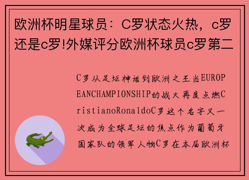 欧洲杯明星球员:C罗状态火热,c罗还是c罗!外媒评分欧洲杯球员c罗第二,第一并不意外