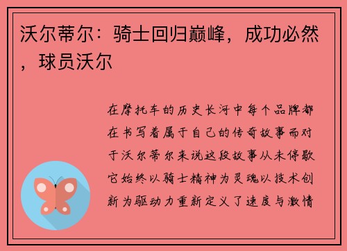 在摩托车的历史长河中,每个品牌都在书写着属于自己的传奇故事。而对于沃尔蒂尔来说,这段故事从未停歇。它始终以骑士精神为灵魂,以技术创新为驱动力,重新定义了速度与激情的内涵。 沃尔蒂尔的骑士精神:传承与责任 沃尔蒂尔的品牌基因中,流淌着对速度的...