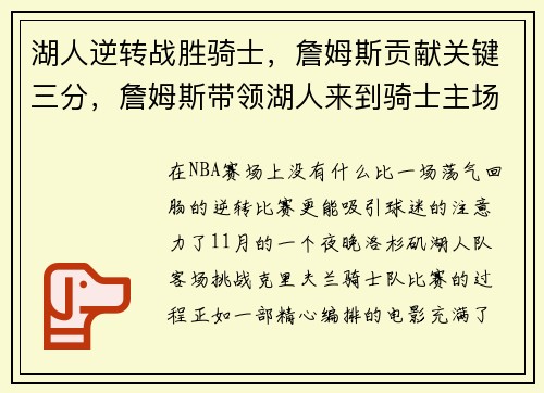 在NBA赛场上,没有什么比一场荡气回肠的逆转比赛更能吸引球迷的注意力了。11月的一个夜晚,洛杉矶湖人队客场挑战克里夫兰骑士队,比赛的过程正如一部精心编排的电影,充满了悬念和高潮。湖人队在勒布朗·詹姆斯的率领下,从落后15分的劣势中逆转局势,...