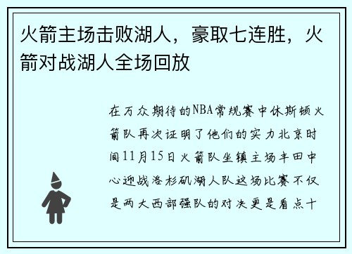 火箭主场击败湖人,豪取七连胜,火箭对战湖人全场回放