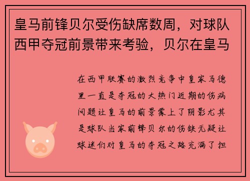 在西甲联赛的激烈竞争中,皇家马德里一直是夺冠的大热门。近期的伤病问题让皇马的前景蒙上了阴影。尤其是球队当家前锋贝尔的伤缺,无疑让球迷们对皇马的夺冠之路充满了担忧。贝尔的缺席不仅影响了球队的进攻火力,也让竞争对手看到了机会。皇马能否在贝尔缺席...
