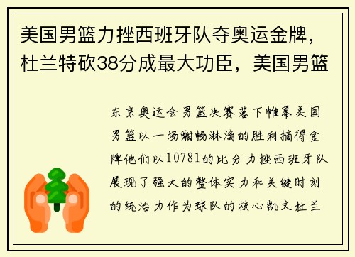 东京奥运会男篮决赛落下帷幕,美国男篮以一场酣畅淋漓的胜利摘得金牌。他们以107-81的比分力挫西班牙队,展现了强大的整体实力和关键时刻的统治力。作为球队的核心,凯文·杜兰特再次证明了自己的价值,全场独得38分,创个人奥运会单场得分新高,成为...