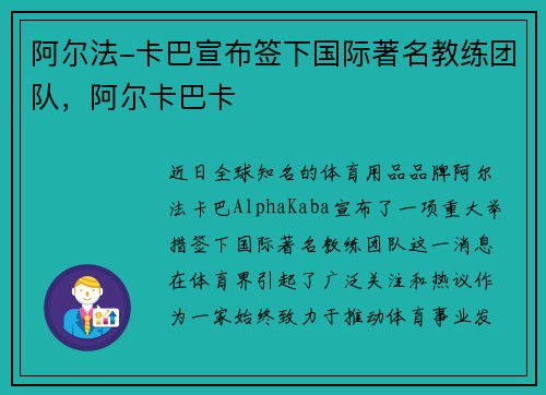 近日,全球知名的体育用品品牌阿尔法-卡巴(Alpha-Kaba)宣布了一项重大举措:签下国际著名教练团队,这一消息在体育界引起了广泛关注和热议。作为一家始终致力于推动体育事业发展的品牌,阿尔法-卡巴此次与国际顶级教练团队的合作,标志着其在体...