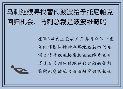 马刺继续寻找替代波波给予托尼帕克回归机会,马刺总裁是波波维奇吗