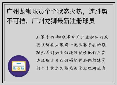广州龙狮球员个个状态火热,连胜势不可挡,广州龙狮最新注册球员