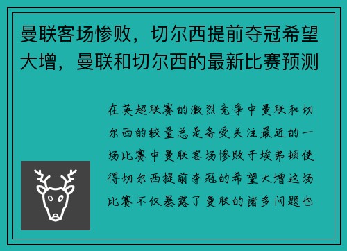 曼联客场惨败,切尔西提前夺冠希望大增,曼联和切尔西的最新比赛预测