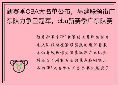 新赛季CBA大名单公布,易建联领衔广东队力争卫冠军,cba新赛季广东队赛程