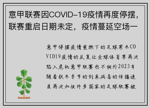 意甲停摆:疫情重燃下的足球寒冬 COVID-19疫情的反复让全球体育界再次陷入危机,意甲联赛也不例外。2023年,随着秋冬季节的到来,病毒的传播速度再次加快,许多国家的足球联赛被迫按下暂停键。意甲联赛,作为全球最具影响力和激情的足球赛事之一...