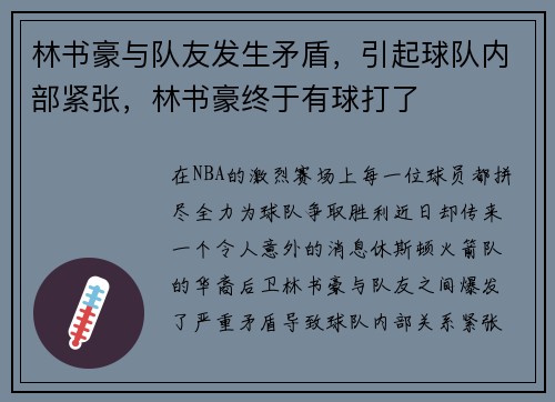 林书豪与队友发生矛盾,引起球队内部紧张,林书豪终于有球打了