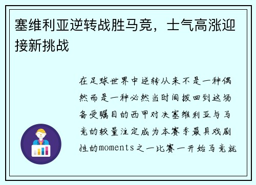 塞维利亚逆转战胜马竞,士气高涨迎接新挑战