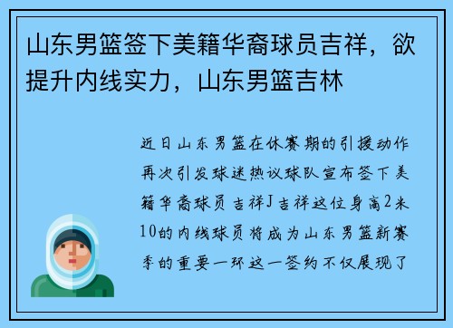 山东男篮签下美籍华裔球员吉祥,欲提升内线实力,山东男篮吉林