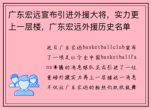 近日,广东宏远basketballclub宣布了一项足以令全中国basketballfans�沸腾的消息:球队正式引进了一位重磅外援,实力再上一层楼。这一消息不仅让广东宏远的粉丝们欢欣鼓舞,也引发了整个篮球界的高度关注。作为CBA赛场上的传...