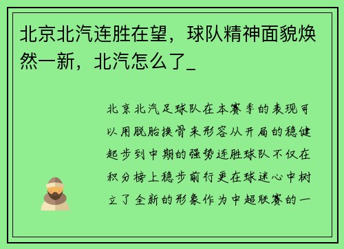 北京北汽连胜在望,球队精神面貌焕然一新,北汽怎么了_