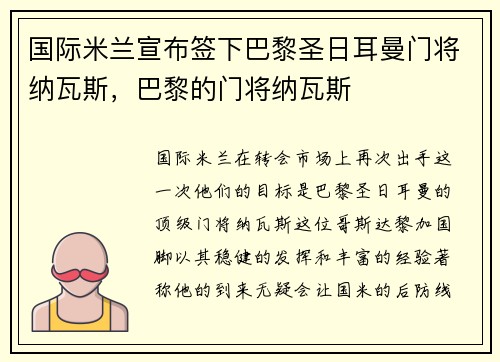国际米兰宣布签下巴黎圣日耳曼门将纳瓦斯,巴黎的门将纳瓦斯