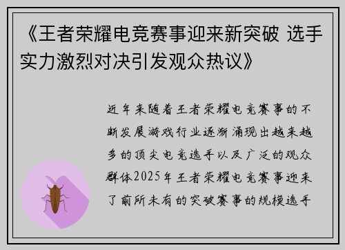 《王者荣耀电竞赛事迎来新突破 选手实力激烈对决引发观众热议》