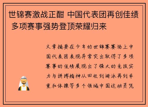 世锦赛激战正酣 中国代表团再创佳绩 多项赛事强势登顶荣耀归来