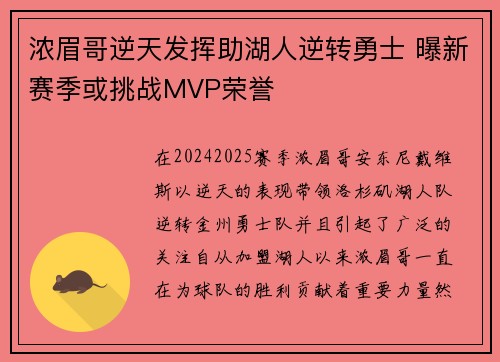 在2024-2025赛季,浓眉哥(安东尼·戴维斯)以逆天的表现带领洛杉矶湖人队逆转金州勇士队,并且引起了广泛的关注。自从加盟湖人以来,浓眉哥一直在为球队的胜利贡献着重要力量。然而,本赛季他的发挥有了显著提升,尤其是在与勇士队的关键比赛中,他...