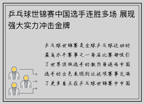 乒乓球世锦赛中国选手连胜多场 展现强大实力冲击金牌