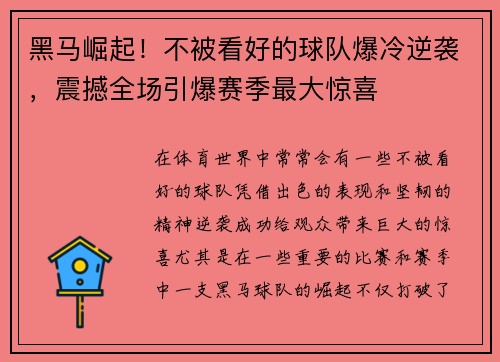 黑马崛起!不被看好的球队爆冷逆袭,震撼全场引爆赛季最大惊喜