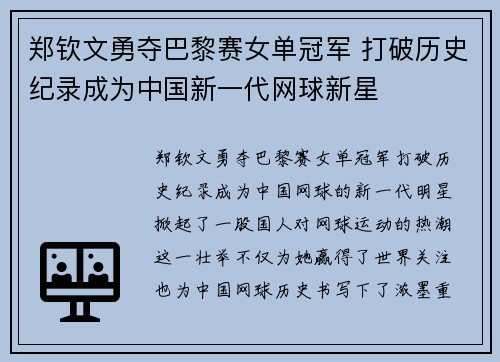 郑钦文勇夺巴黎赛女单冠军 打破历史纪录成为中国新一代网球新星