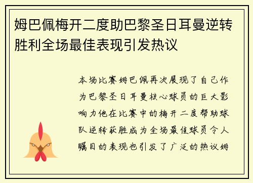 姆巴佩梅开二度助巴黎圣日耳曼逆转胜利全场最佳表现引发热议