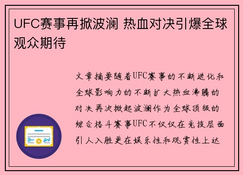 文章摘要:随着UFC赛事的不断进化和全球影响力的不断扩大,热血沸腾的对决再次掀起波澜。作为全球顶级的综合格斗赛事,UFC不仅仅在竞技层面引人入胜,更在娱乐性和观赏性上达到了前所未有的高度。近年来,UFC赛事的激烈对抗、明星选手的涌现以及赛事...