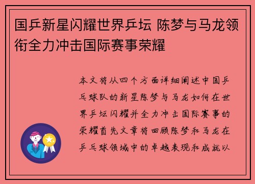本文将从四个方面详细阐述中国乒乓球队的新星陈梦与马龙如何在世界乒坛闪耀,并全力冲击国际赛事的荣耀。首先,文章将回顾陈梦和马龙在乒乓球领域中的卓越表现和成就,以及他们如何成为国乒的领军人物。接着,我们将分析他们在国际赛事中的出色表现,以及如何...