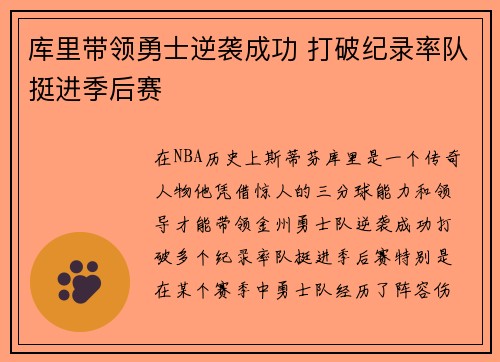 在NBA历史上,斯蒂芬·库里是一个传奇人物,他凭借惊人的三分球能力和领导才能,带领金州勇士队逆袭成功,打破多个纪录,率队挺进季后赛。特别是在某个赛季中,勇士队经历了阵容伤病困扰、状态低迷等种种挑战,库里的表现依然出色,不仅刷新了个人和团队的...