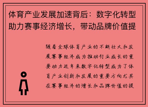 体育产业发展加速背后:数字化转型助力赛事经济增长,带动品牌价值提升