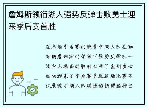 詹姆斯领衔湖人强势反弹击败勇士迎来季后赛首胜
