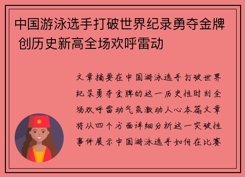 中国游泳选手打破世界纪录勇夺金牌 创历史新高全场欢呼雷动