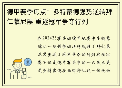 德甲赛季焦点:多特蒙德强势逆转拜仁慕尼黑 重返冠军争夺行列