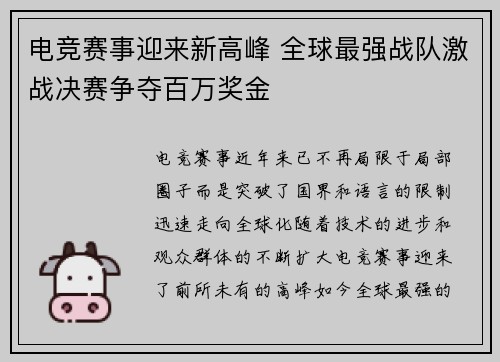 电竞赛事迎来新高峰 全球最强战队激战决赛争夺百万奖金