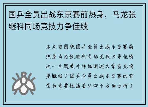 本文将围绕“国乒全员出战东京赛前热身,马龙张继科同场竞技力争佳绩”这一主题展开详细阐述。文章首先简要概括了国乒全员出战东京赛的背景和重要性,接着从四个方面分析了这次赛前热身的具体情况,包括国乒队员备战状态的调整、马龙与张继科的竞技表现、赛前...