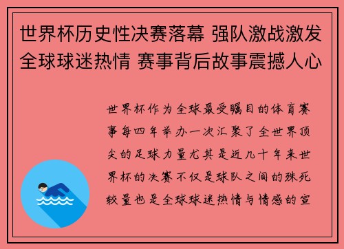 世界杯历史性决赛落幕 强队激战激发全球球迷热情 赛事背后故事震撼人心