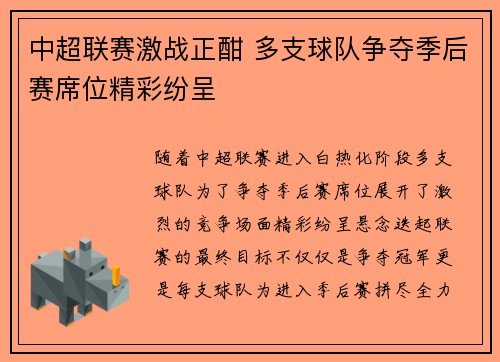 中超联赛激战正酣 多支球队争夺季后赛席位精彩纷呈