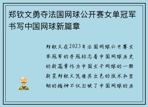 郑钦文勇夺法国网球公开赛女单冠军书写中国网球新篇章