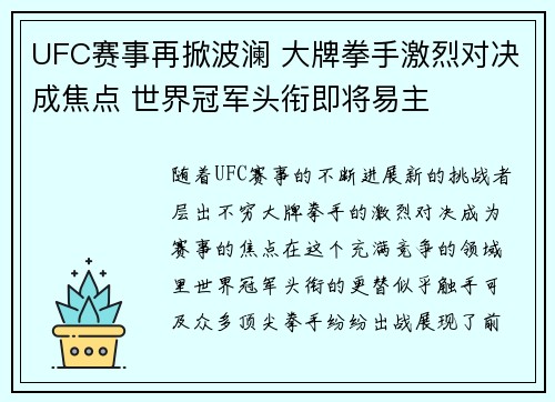 UFC赛事再掀波澜 大牌拳手激烈对决成焦点 世界冠军头衔即将易主