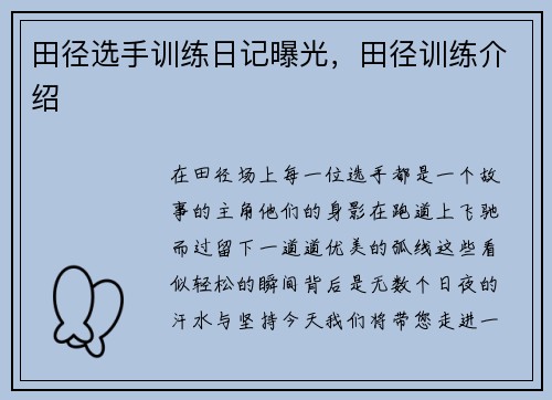 在田径场上,每一位选手都是一个故事的主角。他们的身影在跑道上飞驰而过,留下一道道优美的弧线。这些看似轻松的瞬间背后,是无数个日夜的汗水与坚持。今天,我们将带您走进一位顶级田径选手的训练日记,揭开他们成功背后的秘密。 清晨5点,当大多数人都还...