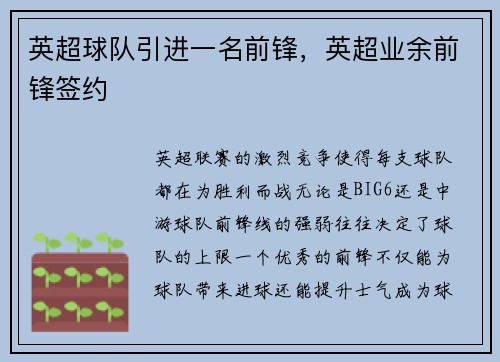 英超联赛的激烈竞争使得每支球队都在为胜利而战。无论是BIG6还是中游球队,前锋线的强弱往往决定了球队的上限。一个优秀的前锋不仅能为球队带来进球,还能提升士气,成为球迷心中的偶像。因此,当一支英超球队决定引进一名前锋时,这不仅仅是一次转会市场...
