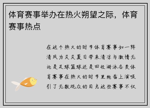 在这个热火的时节,体育赛事如一阵清风,为炎炎夏日带来清凉与激情。无论是足球、篮球,还是田径、游泳,各类体育赛事在热火的时节里轮番上演,吸引了无数观众的目光。这些赛事不仅展现了运动员的拼搏精神,也为人们提供了一个释放压力、享受运动乐趣的绝佳机...