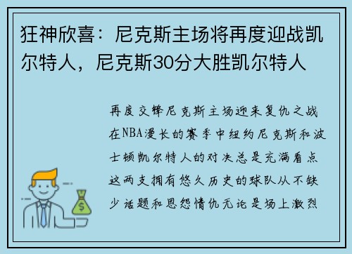 狂神欣喜:尼克斯主场将再度迎战凯尔特人,尼克斯30分大胜凯尔特人