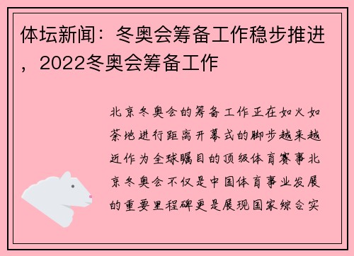 体坛新闻:冬奥会筹备工作稳步推进,2022冬奥会筹备工作