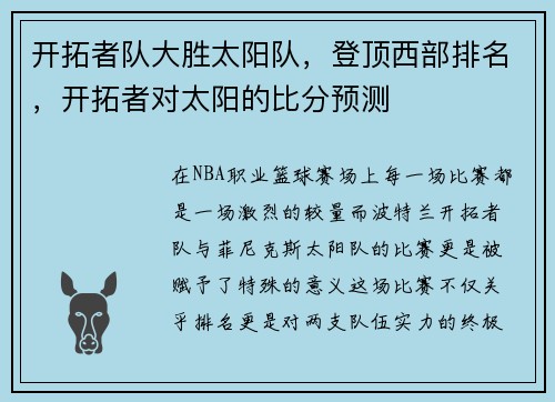 开拓者队大胜太阳队,登顶西部排名,开拓者对太阳的比分预测